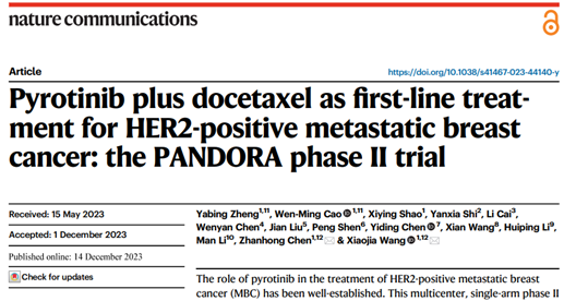 1. Zheng, Y., Cao, WM., Shao, X. et al. Pyrotinib plus docetaxel as first-line treatment for HER2-positive metastatic breast cancer: the PANDORA phase II trial. Nat Commun 14, 8314 (2023).
